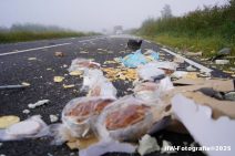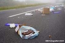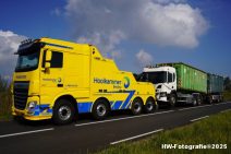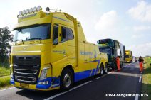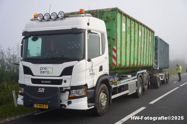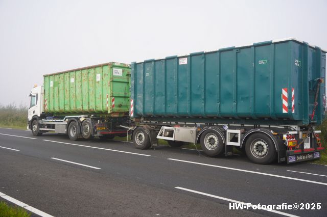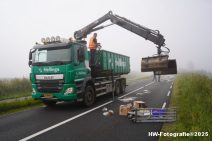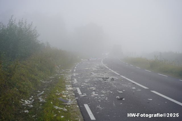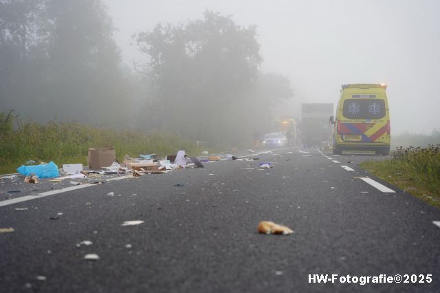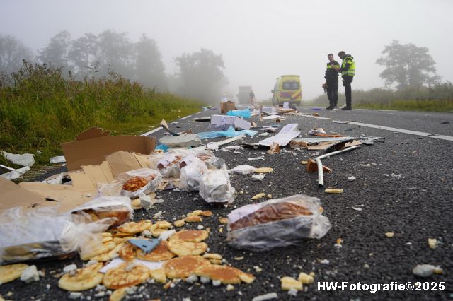 De container op de aanhanger scheurde de bakwagen open waardoor de inhoud van diepvriesproducten bezaaid kwam te liggen over de weg. Een automobilist botste op de diverse brokstukken maar kon later zelf zijn weg vervolgen. De beide vrachtwagens moesten worden afgesleept. Hiervoor kwam bergingsbedrijf Hooikammer in actie met een tweetal zware bergingsvoertuigen. De chauffeurs werden gecontroleerd door ambulancepersoneel en bleken ongedeerd.